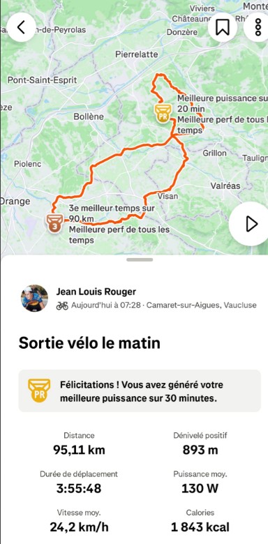 Parti vers 7h30, le quatuor progressa ensemble sur ce parcours bucolique, en direction de Cairanne. Mais dès les premières pentes, Alain montra ses limites physiques du moment, pénalisé par le quintal de sa carcasse de rugbyman, lui qui ne renoua avec la bicyclette que récemment. Mais pas de panique, il savait qu’au sommet, il retrouverait les collègues conformément à l’état d’esprit solidement ancré au sein de l’USP. Ils progressèrent à nouveau ensemble vers Saint-Roman-de-Malegarde, puis Tulette et Richerenche, avant de rejoindre le ravitaillement installé à Montségur-sur-Lauzon. Après avoir bu un verre de sirop ou de coca cola, et gouter aux gâteaux secs, quartiers d’orange, bananes ou petits sandwichs salés, ils reprirent la route vers Chamaret, puis Chantemerle-lès-Grignan avant de se séparer. Alain qui reprenait tout juste le vélo, avait opté courageusement pour le parcours de 85km, tandis que le trio s’était inscrit pour le grand circuit de 95km. Ils se séparèrent donc au pied d’une nouvelle ascension, Alain en direction du ravitaillement déjà visité, et Gilbert, Jean Louis et Luc vers Lagarde-Adhémar. Alain dut affronter une nouvelle pente à fort pourcentage pour regagner Montségur-sur-Lauzon. Après s’être restauré, il profita d’une belle descente qui l’emmena à Suze-la-Rousse, avant de rallier Camaret-sur-Aigues par Sérignan-du-Comtat. Était-ce les circonstances, toujours est-il, qu’il ne vit personne sur ce parcours, ce qui l’obligeât à guetter le fléchage rouge fluo utilisé par les organisateurs, pour le guider jusqu’au point de chute. Quant au trio, ils durent monter jusqu’au village de la Lagarde-Adhémar, avant d’escalader une autre difficulté pour rejoindre Clansayes, et de revenir à Montségur-sur-Lauzon où le ravitaillement était presque démuni de victuaille, victime du succès de l’épreuve. Sans perdre de temps, ils reprirent la route sur les traces d’Alain avec l’espoir de le retrouver avant l’arrivée. Ce ne fut pas le cas, puisque les difficultés derrière lui, Alain rallia le complexe sportif de façon dynamique. Pourtant le trio ne chauma point. Jean Louis qui avait perdu cinq kilos, décida d’accrocher les roues d’un groupe qui filait à vive allure. C’est ainsi qu’ils rejoignirent le complexe sportif quinze minutes après Alain, qui sirotait un verre de coca cola en attendant les copains. Enfin presque puisque Luc creva à trois kilomètres de l’arrivée. Après concertation, Gilbert revint vers lui en voiture pour charger le vélo avant de retrouver Alain et Jean Louis qui avaient eu le temps de se changer. Ils prirent un dernier verre ensemble avant de rentrer vers les Paluds, satisfait des panoramas offerts par le tracé adroitement dessiné au milieu des villages de caractère du Comtat Venaissin. Jean Louis partagea le compte rendu de son ordinateur de vélo sur le groupe WhatsApp de l’USP.