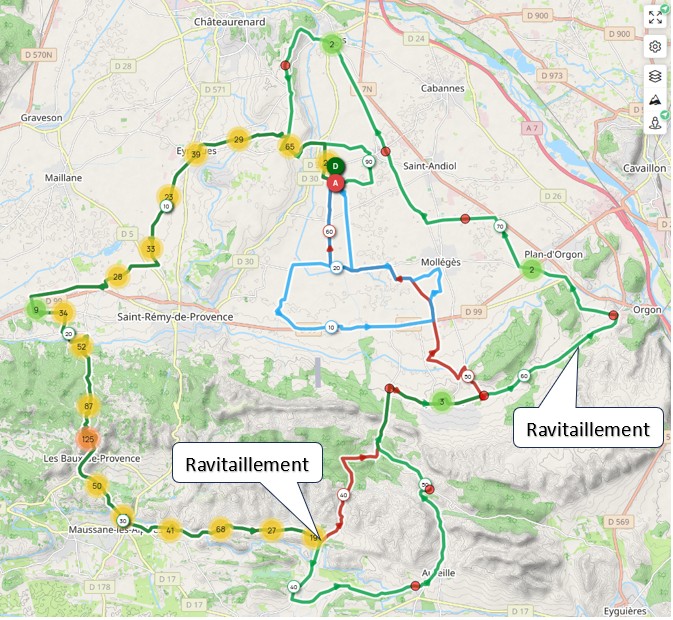 Le circuit de 60km, D+ 566m (Openrunner 22989558) : Ce parcours cheminait sur de petites routes reliant de beaux villages au sein du massif des Alpilles. La montée du Val d’Enfer débouche sur Les Baux de Provence labellisé « Plus beau Village de France ». Avec son château en ruines et ses belles maisons plusieurs fois centenaires, le village des Baux-de-Provence possède un charme unique. Puis les coureurs étaient guidés jusqu’à Eygalières, où trône la majestueuse chapelle Saint Sixte, avant de revenir vers les Paluds de Noves.